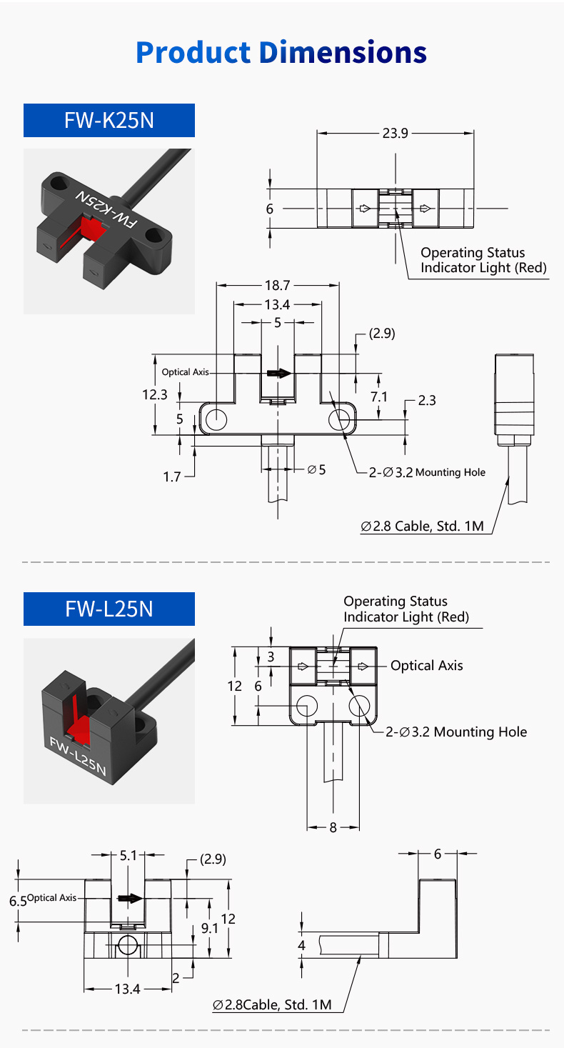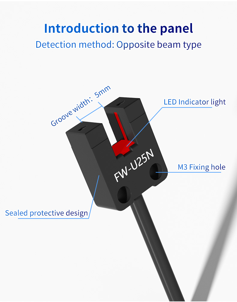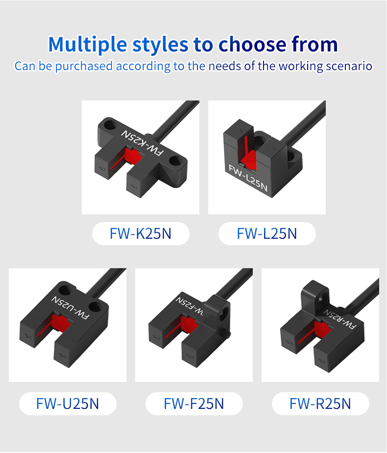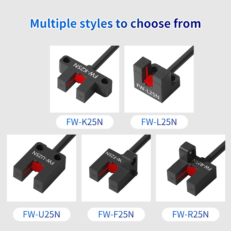メタ説明: 検出幅 5mm の FW25 シリーズ U 溝光電センサーをご覧ください。インテリジェントチップ、一体型ハウジング、原点検出、回転速度監視、ガイドレール制御用の多彩なスタイルを特徴としています。堅牢な産業オートメーションアプリケーションに最適です。