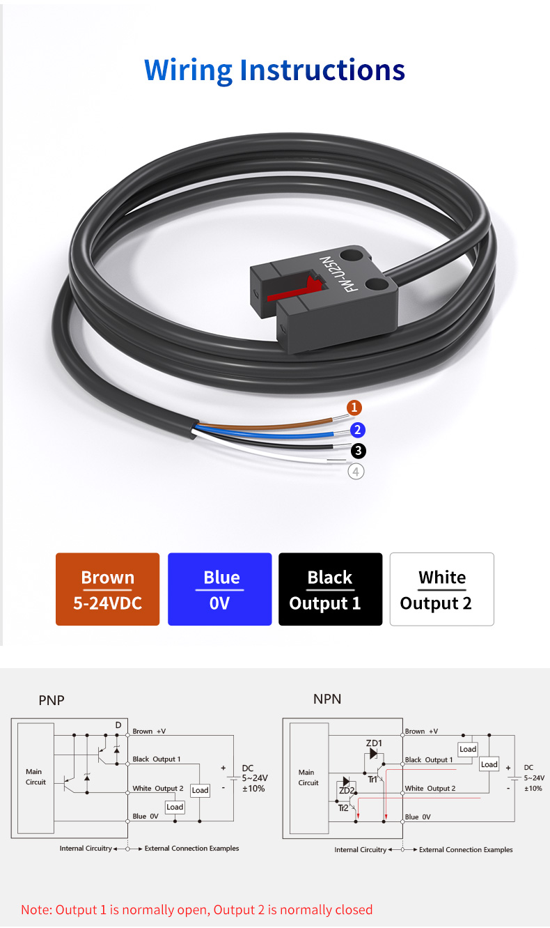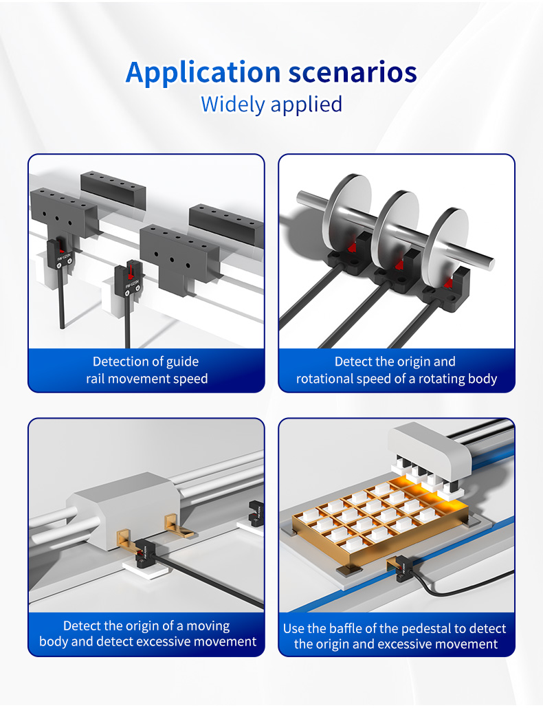 FW25 U 溝センサーの多用途性により、パッケージング、マテリアル ハンドリング、CNC 加工、組立自動化など、多くの業界で頼りになるコンポーネントとなっています。 ガイド レールの移動速度の検出: リニア モーション システムでは、移動するキャリッジに取り付けられたフラグが U 溝を通過できます。 FW25 は、時間の経過とともにパルスをカウントすることにより、ガイド レールの線形速度を正確に計算し、速度の監視と制御を可能にします。移動体の原点とオーバートラベルを検出: このセンサーは、原点復帰シーケンスに最適です。リニア アクチュエータまたはロボット アームのタブが溝を通過し、正確な「ホーム」または「原点」信号をコントローラに提供します。さらに、オーバートラベルを検出するために2番目のセンサーを移動の最後に配置することで、機械的損傷を防止し、動作の安全性を確保できます。回転体の原点と回転速度を検出: 回転軸に単一のタブまたは多歯ホイールを取り付けます。各タブが 5 mm の溝を通過すると、FW25 はパルスを生成します。 1 回転あたり 1 つのパルスで原点データが得られ、複数のパルスで正確な回転速度 (RPM) を計算できます。これは、モーター制御やプロセス監視に不可欠です。位置決め用の取り付けブラケット バッフルと併用: 多くのシステムは、シンプルな固定バッフルを使用します。 FW25 を取り付けブラケットまたはカスタム固定具と組み合わせて、これらのバッフルの存在または位置を検出し、シンプルでコスト効率の高いリミット スイッチング システムを作成できます。