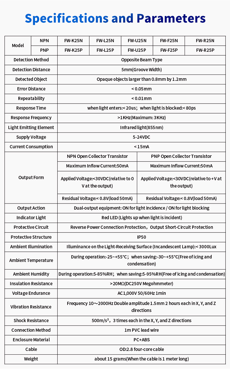 要求の厳しい産業オートメーションの世界では、信頼性と精度は単なる機能ではなく、必需品です。 FW25 シリーズ U 溝光電センサは、これらの重要な要求を満たすように設計されており、幅広いセンシング アプリケーションに対して比類のない精度と耐久性を提供します。標準化された 5mm の U 溝検出幅を備えたこのセンサーは、小型コンポーネントの検出、正確な位置決め、モーション制御において一貫したパフォーマンスを必要とするエンジニアやシステム インテグレーターにとって理想的なソリューションです。