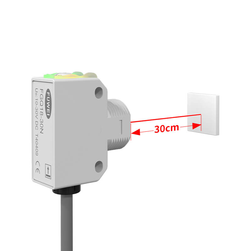 FGQ18-30N センサの拡散反射設計により、表面からの反射光を測定することで物体を検出できます。この機能により、コンベア ベルト、組立ライン、包装機械など、正確で信頼性の高い検出が重要な幅広い用途に適しています。
