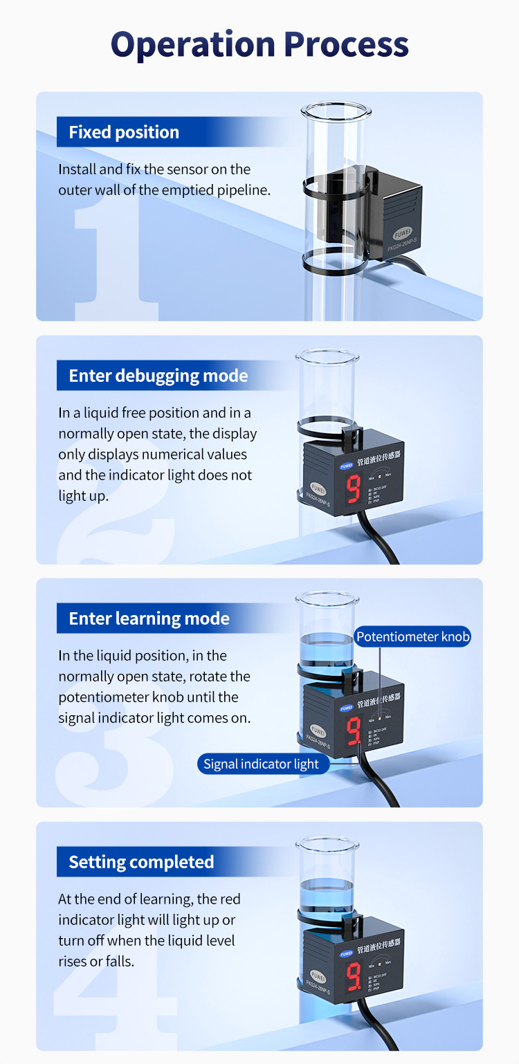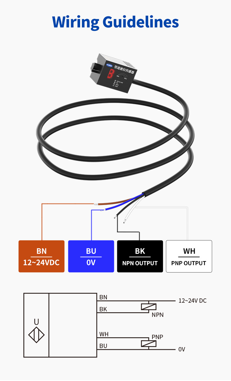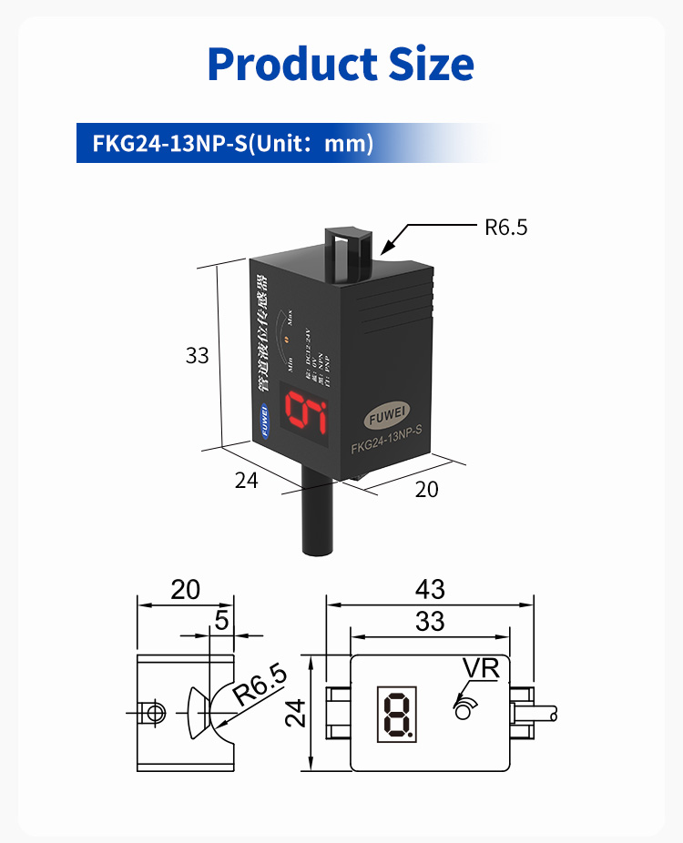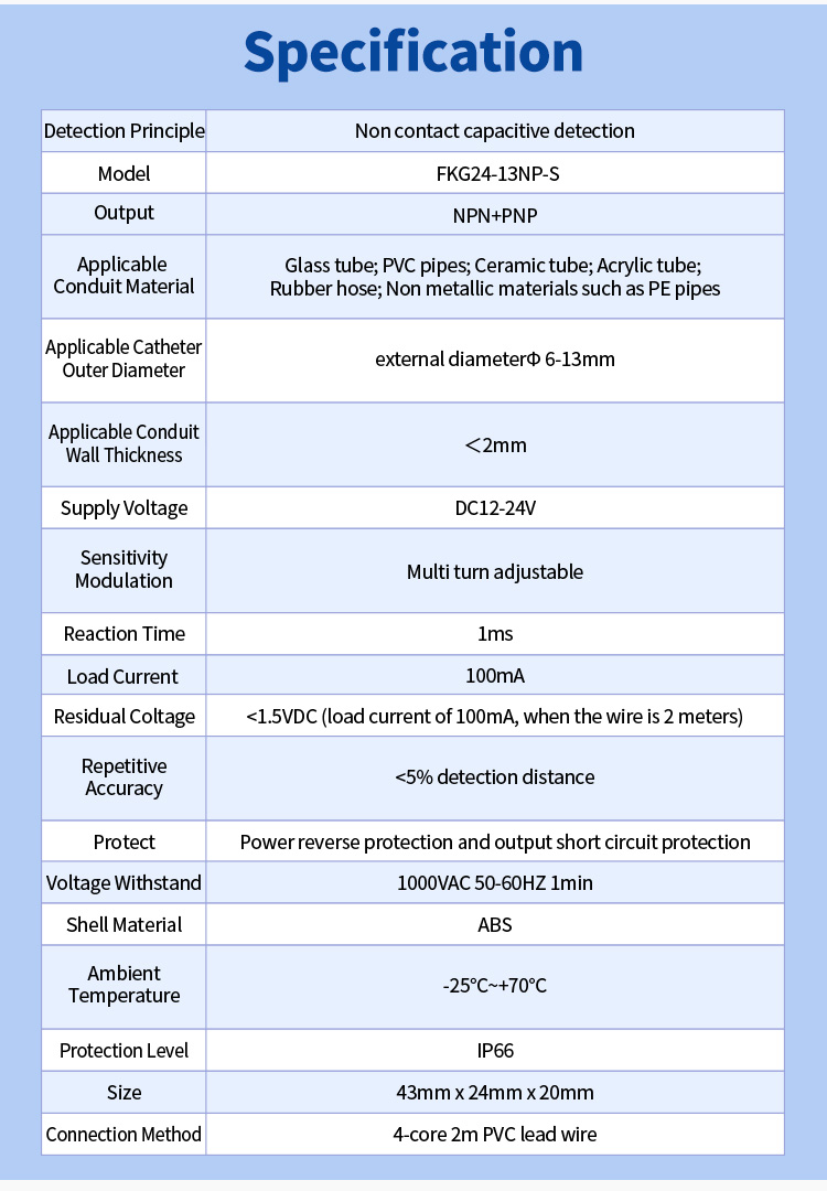 検出原理 非接触容量性検出 モデル FKG24-13NP-S FKG24-26NP-S 出力 NPN+PNP 該当する 電線管の材質 ガラス管; PVCパイプ;セラミックチューブ;アクリルチューブ;ゴムホース、PEパイプなどの非メタリック材料 適用されるカテーテルオーターの直径 外径6-13mm 外径は12-26mm 適用電線管 壁の厚さ <2mm <3mm 供給電圧 DC12-24V 感度 変調 マルチターン調整可能 反応時間 1ミリ秒 負荷電流 100mA 残留コルタージ <1.5VDC(ワイヤが2メートルの場合、100mAの荷重電流) 繰り返し 正確さ <5%検出距離 守る パワーリバース保護と出力短絡保護 電圧に耐える 1000VAC 50-60Hz 1分 シェル素材 腹筋 アンビエント 温度 -25°C〜+70°C 保護レベル IP66 サイズ 43mmx24mm x20mm 33mm x 34mm x 20mm 接続方法 4コア2M PVCリードワイヤ