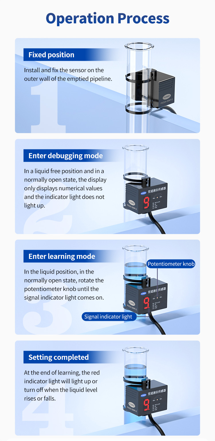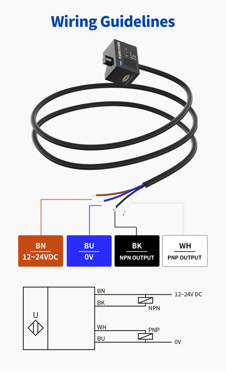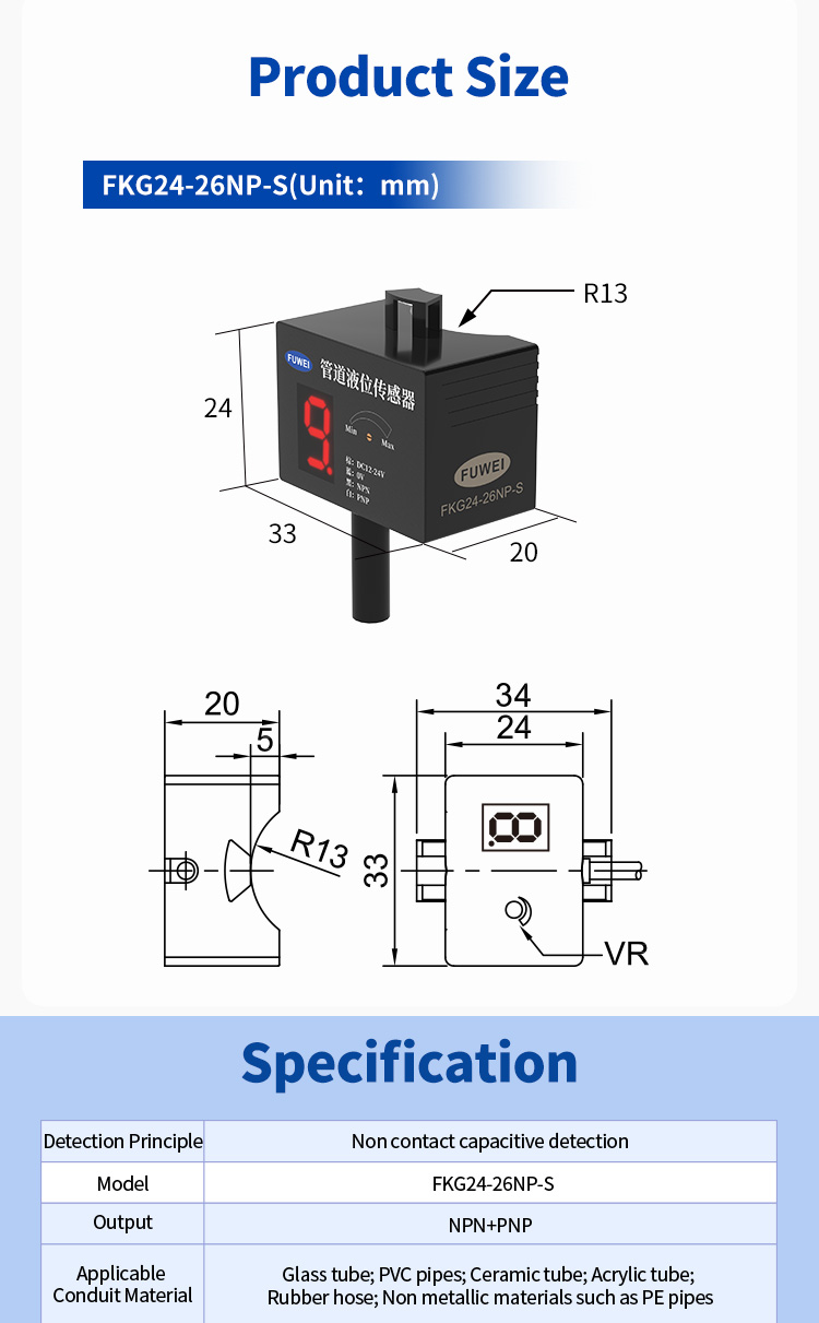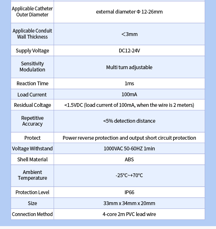 インストール方法 埋め込まれていない モデル NPN+PNP Digital DisplayFKG24-13NP-S デジタルディスプレイ FKG24-26NP-S 出力mothod NPN+PNP 供給電圧 DC12-24V 適用されるパイプ材料 ガラス管。 PVCチューブ、セラミックチューブ、アクリルチューブ、ゴムチューブ; PEチューブおよびその他の非金属材料 適用可能なパイプ外径 外径:$6-Ф13mm 外径:中13~中26mm 適用可能なパイプの壁の厚さ 壁の厚さ<2mm 壁の厚さ<3mm 測定範囲 13mm 26mm 感度調整 マルチターン調整可能 応答時間 1ms 電流をロードします 100mA 残留電圧 <1.5VDC(電流100mA、ワイヤーウェイ2mを負荷) 繰り返し精度 <5% 守る バッテリーリバース接続保護、出力短絡保護 電圧に耐える 1000VAC 50-60Hz 1分 ケースマテリアル ABSプラスチック 操作Tempinternational -20〜70°C 保護 IP66 寸法 l*w*h 43*24*20mm L*W*H 33*34*20mm 接続ノード 4ピン2M PVCケーブル