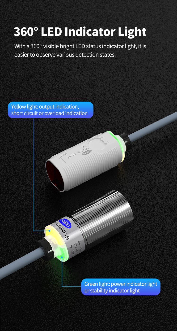 FGY18-10NU-Bは、明るい360°の可視LEDステータスインジケーターを備えています。オペレーターは、あらゆる角度からセンサーの動作ステータスを楽に監視できます。この設計により、CNCマシンオペレーターのリアルタイムの監視とデバッグが大幅に容易になり、不明確なステータスインジケーターによるダウンタイムが短縮され、生産効率が向上します。