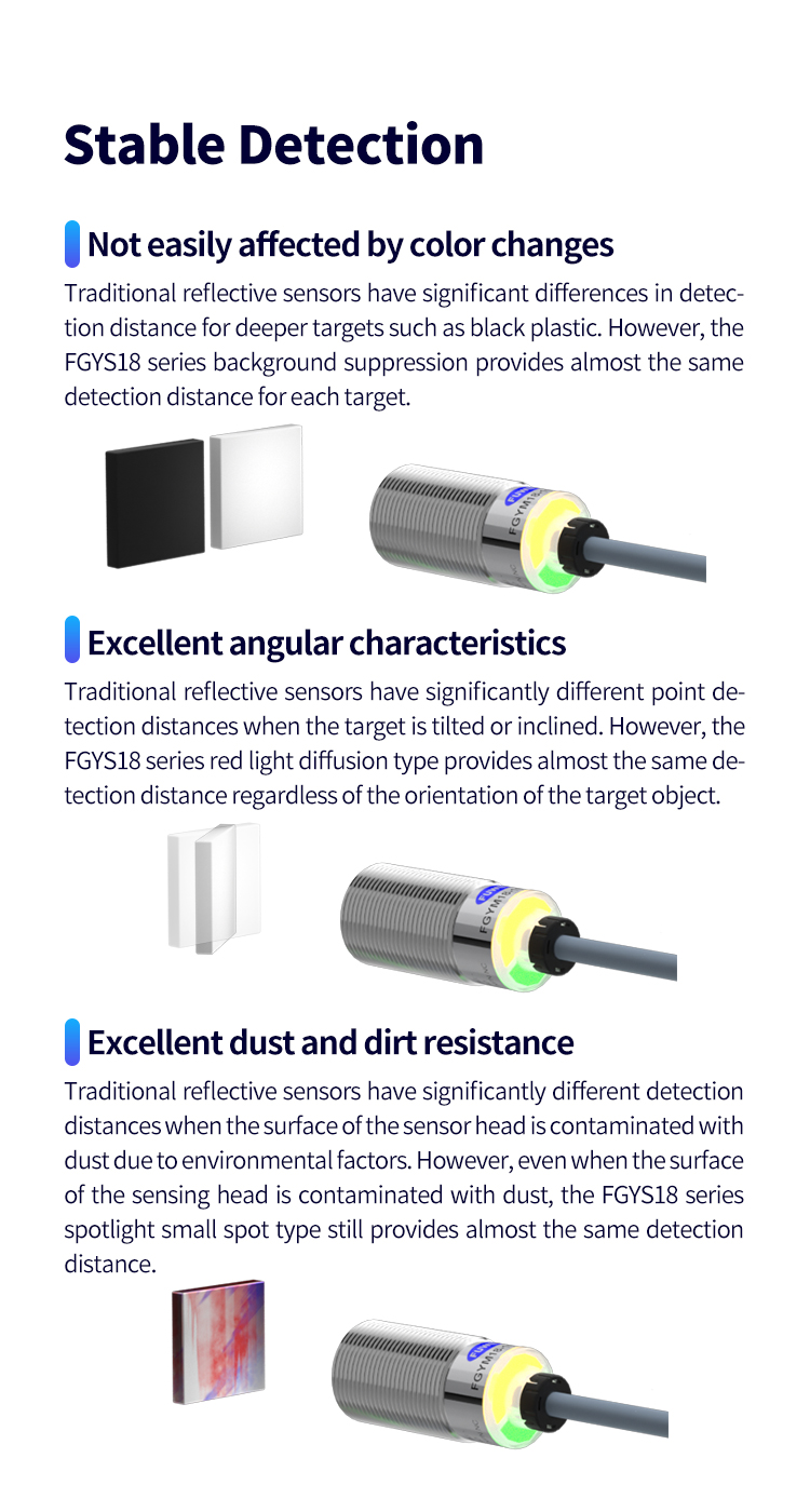 従来のセンサーは、色や材料のバリエーションのためにオブジェクトを検出できないことがよくあります。 FGY18-10NU-Bは、高度な光学設計を使用して、色や素材に関係なくオブジェクトの安定した検出を実現します。 CNC加工中に金属部品、プラスチックワークピース、または暗い色の材料を検出するかどうかにかかわらず、一貫した感度を維持し、シームレスで正確な生産プロセスを確保します。