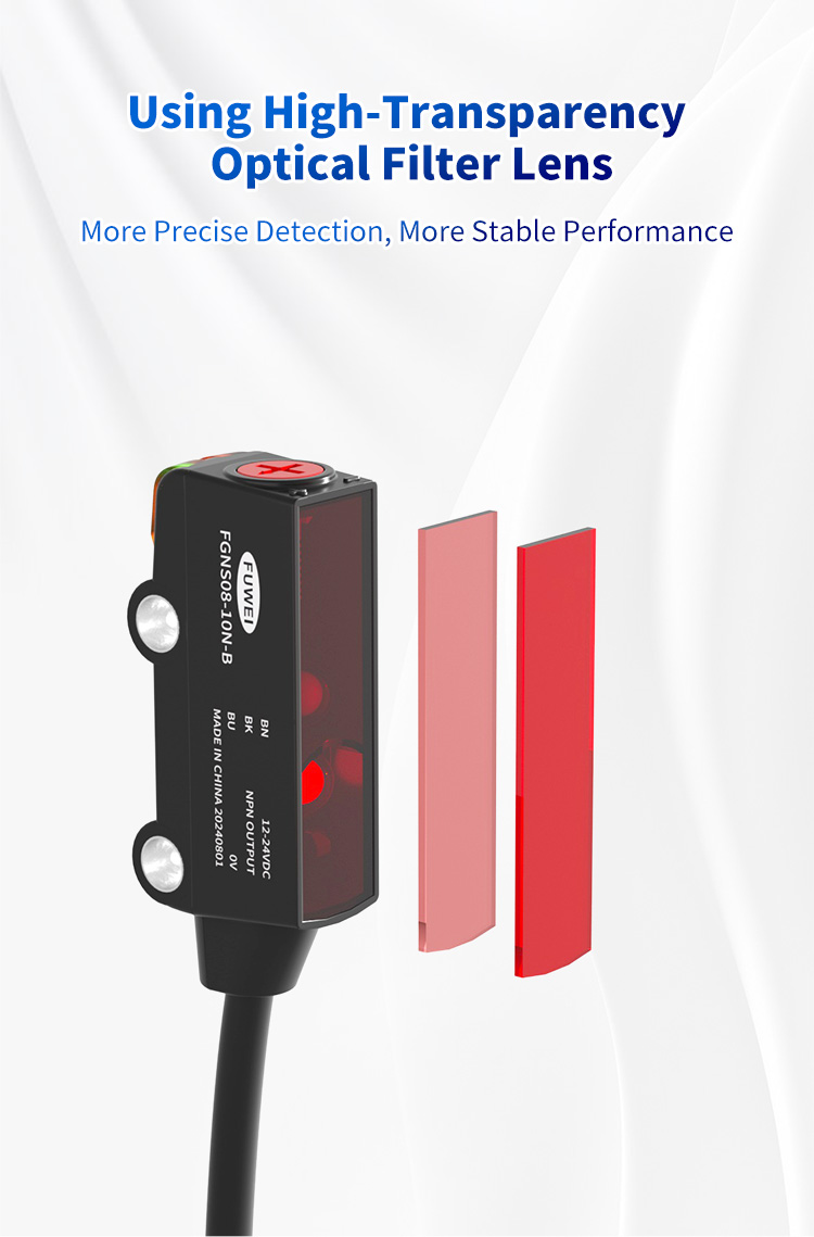 複雑な産業環境では、さまざまな光および電磁干渉がセンサーの検出精度に影響を与えることがよくあります。 FGNS08-08シリーズは、周囲の光と電磁干渉を効果的にフィルタリングする特別な高トランスミッションフィルターレンズを採用しており、センサーが有効な検出信号のみを受信するようにします。