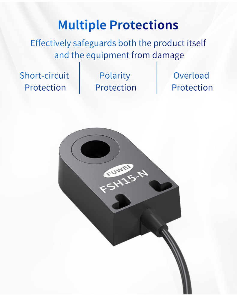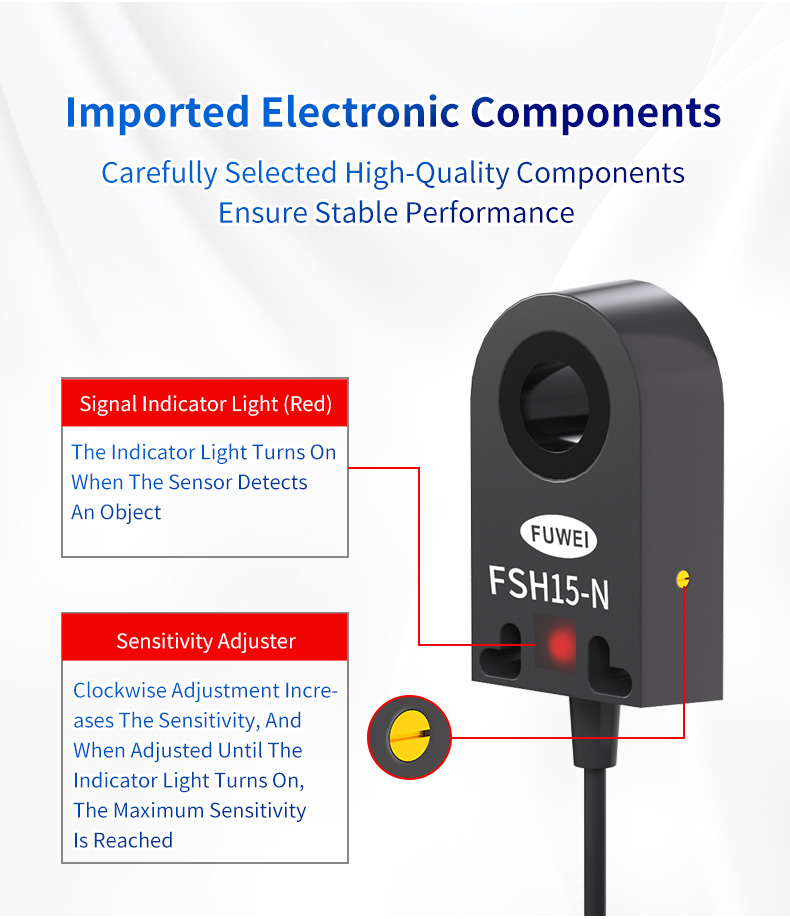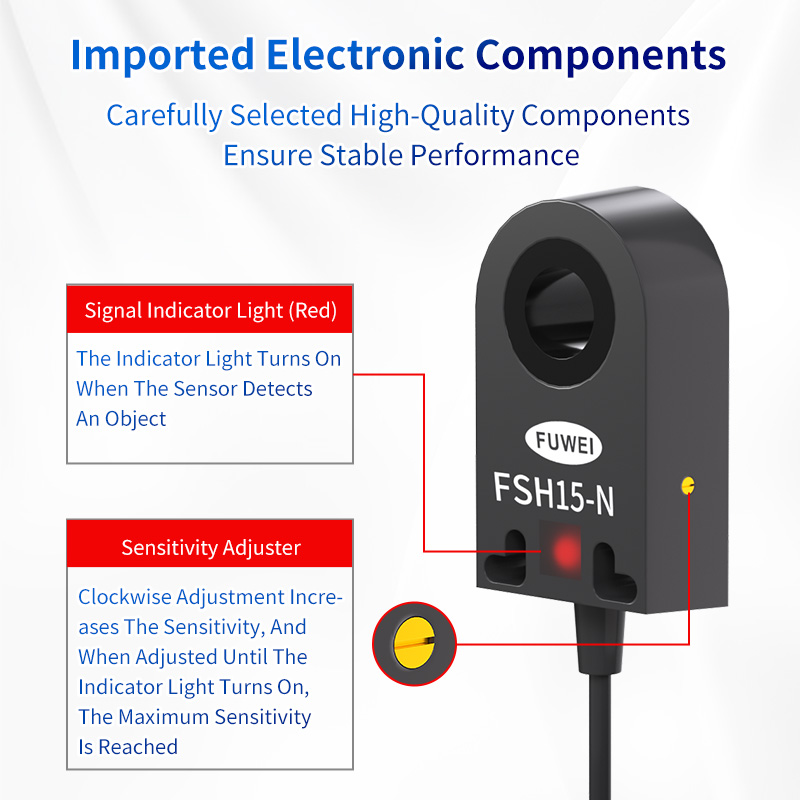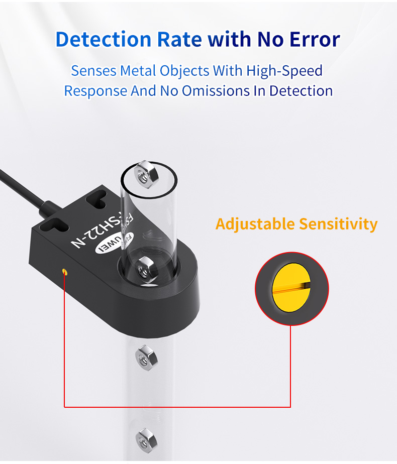 FSH05 ~ FSH44 シリーズの中心的な革新は、完全にブラインド ゾーンのない検出フィールドにあります。従来のリング センサーには多くの場合、入口または出口にデッド スポットがあり、小さくて高速で移動するコンポーネントのカウントを見逃します。これは、ボール ベアリングの計数やネジの検証などのアプリケーションにおける重大な障害点です。