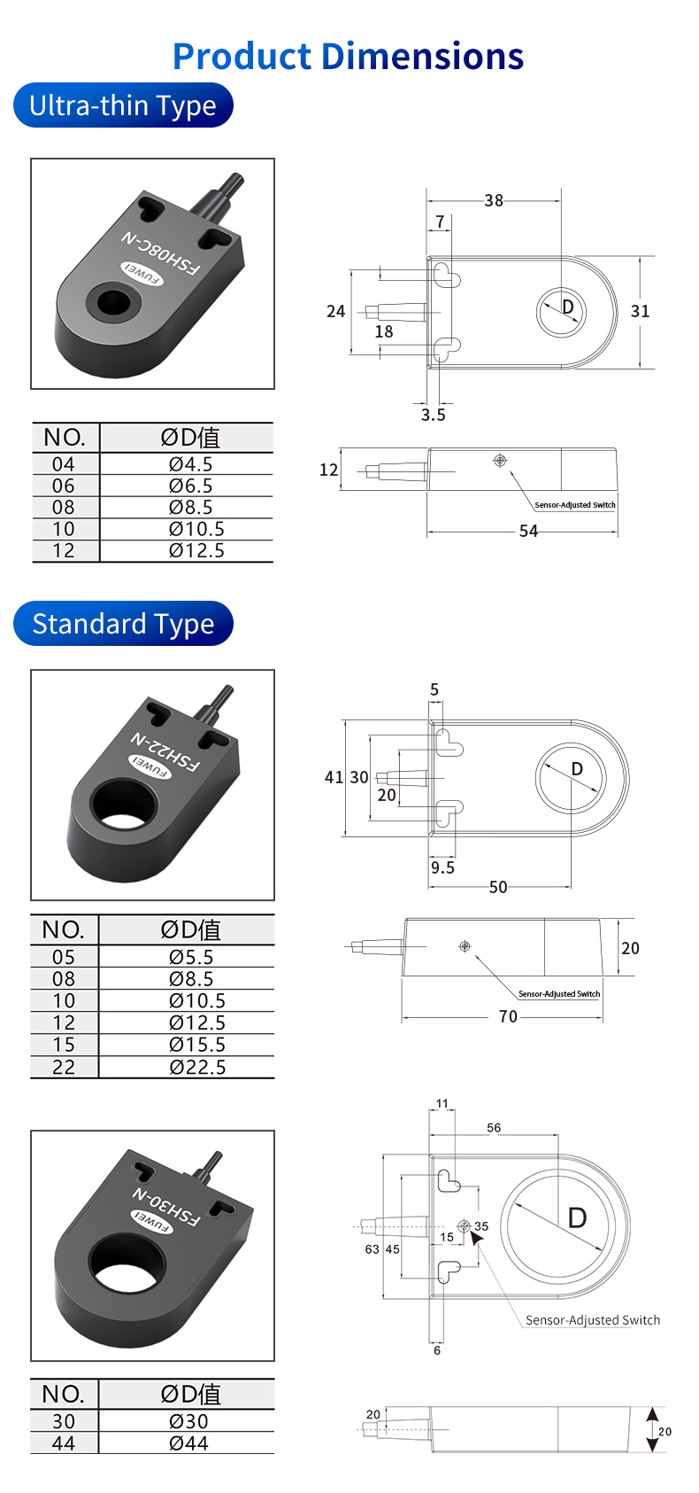 あらゆるアプリケーションに対応するセンサー私たちは、同じ自動化セットアップが 2 つとして存在しないことを理解しています。そのため、FSH05 ~ FSH44 シリーズは 2 つの異なるフォーム ファクターと複数の開口サイズで利用できます。超薄型タイプ: 実装スペースが限られている、スペースに制約のある環境に最適です。スリムなプロファイルにより、検出性能を損なうことなく、狭い機械に取り付けることができます。標準タイプ: 汎用アプリケーションに堅牢な性能を提供し、頑丈で信頼性の高いセンシング ソリューションを提供します。